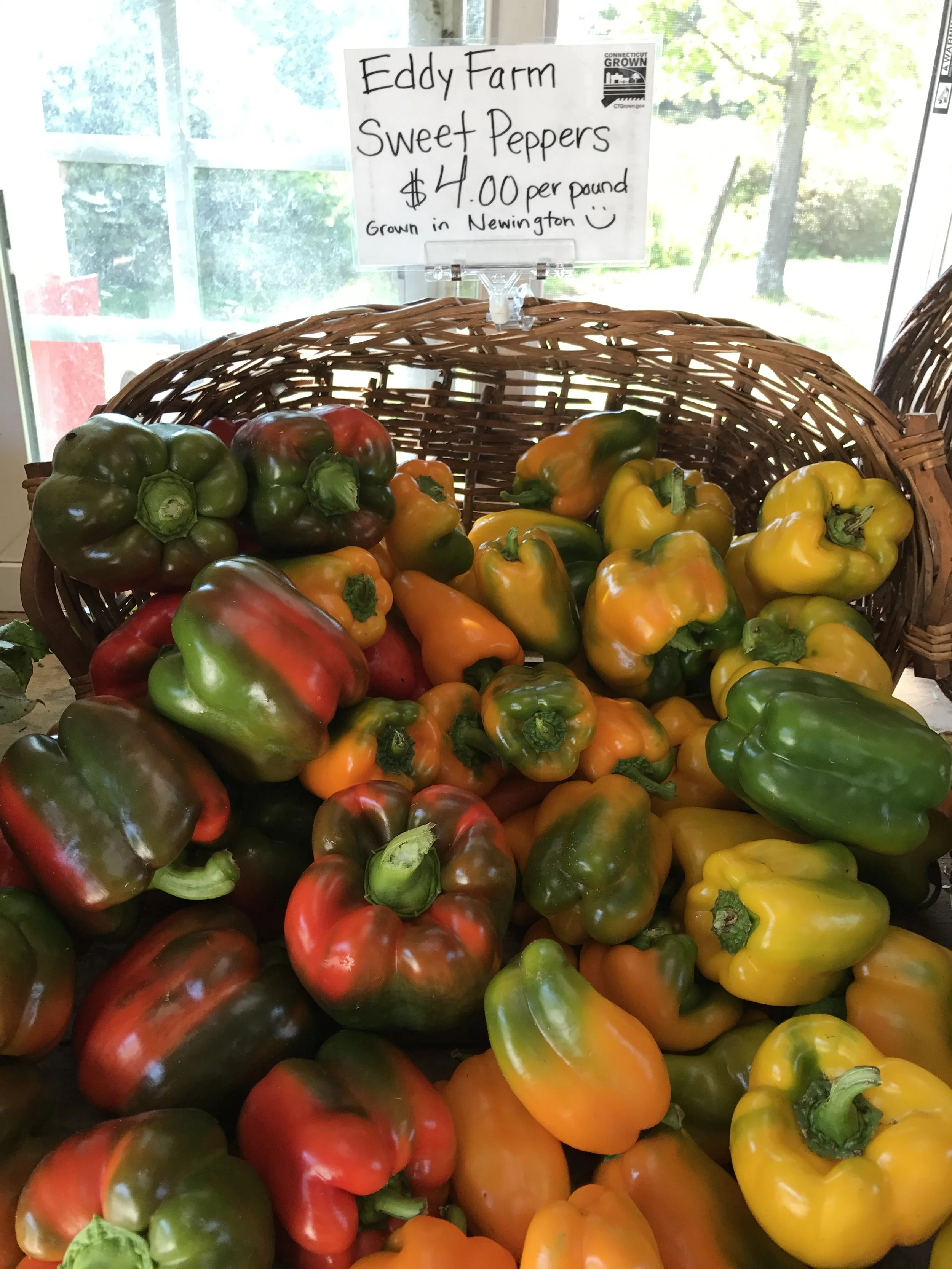 Today's produce menu: silver queen corn, honeybun corn, butter & sugar corn, lettuce, radishes, green beans, native tomatoes, native heirloom tomatoes, sweet peppers, dried red and white onions, garlic, honeycrisp apples, McIntosh apples, macoun apples, peaches, nectarines, salad cucumbers, yellow squash, zucchini, beets, rainbow Swiss chard, kale, bread from Hartford Baking Co., zinnia and mixed bouquets from here on the farm.