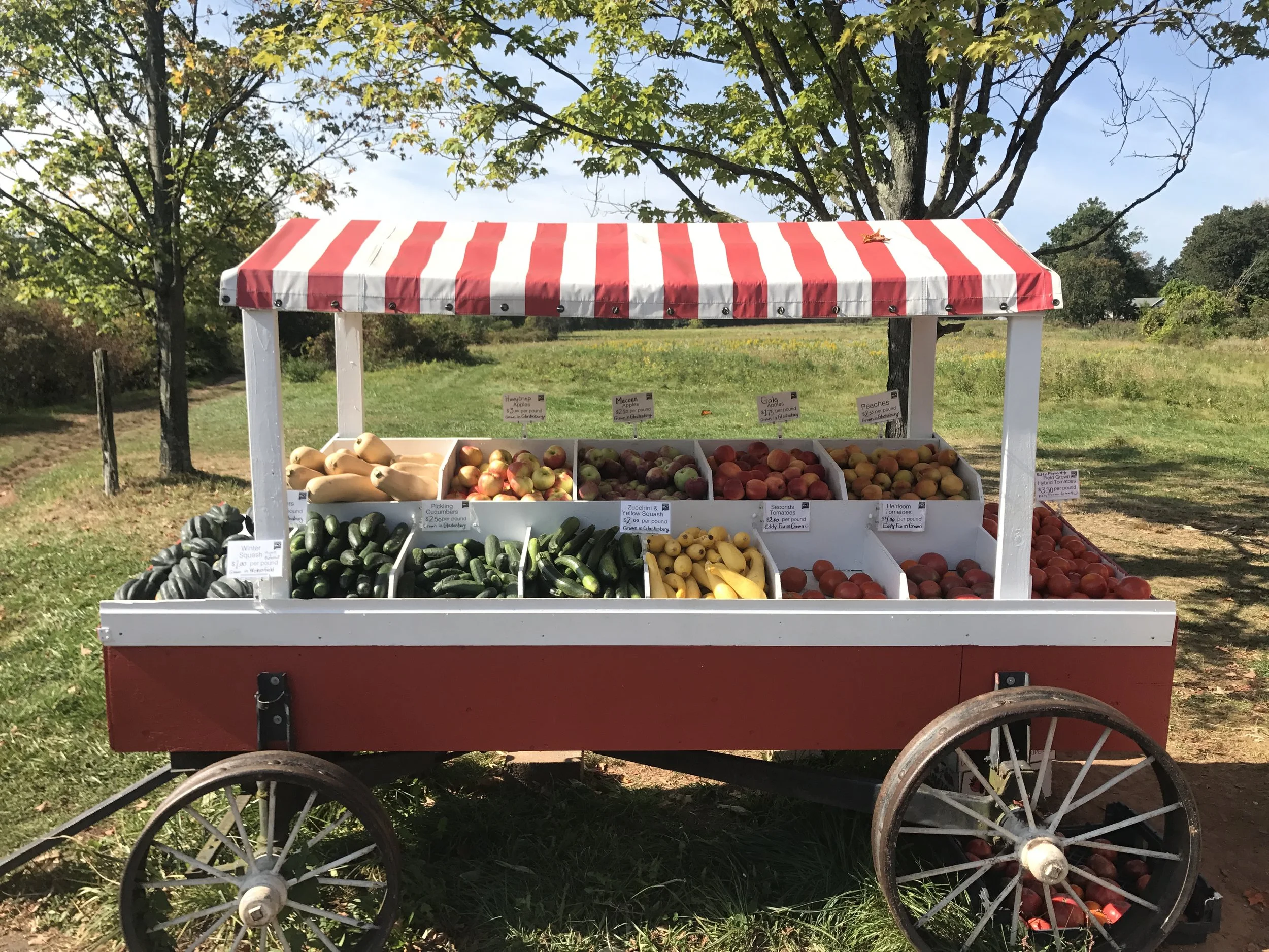 Today's produce menu: silver queen corn, honeybun corn, butter & sugar corn, radishes, beets, native tomatoes, native heirloom tomatoes, seconds tomatoes, sweet peppers, dried red and white onions, honeycrisp apples, gala apples, macoun apples, peaches, acorn squash, butternut squash, yellow squash, zucchini, pickling cucumbers, kale, bread from Hartford Baking Co., and mixed bouquets from here on the farm.