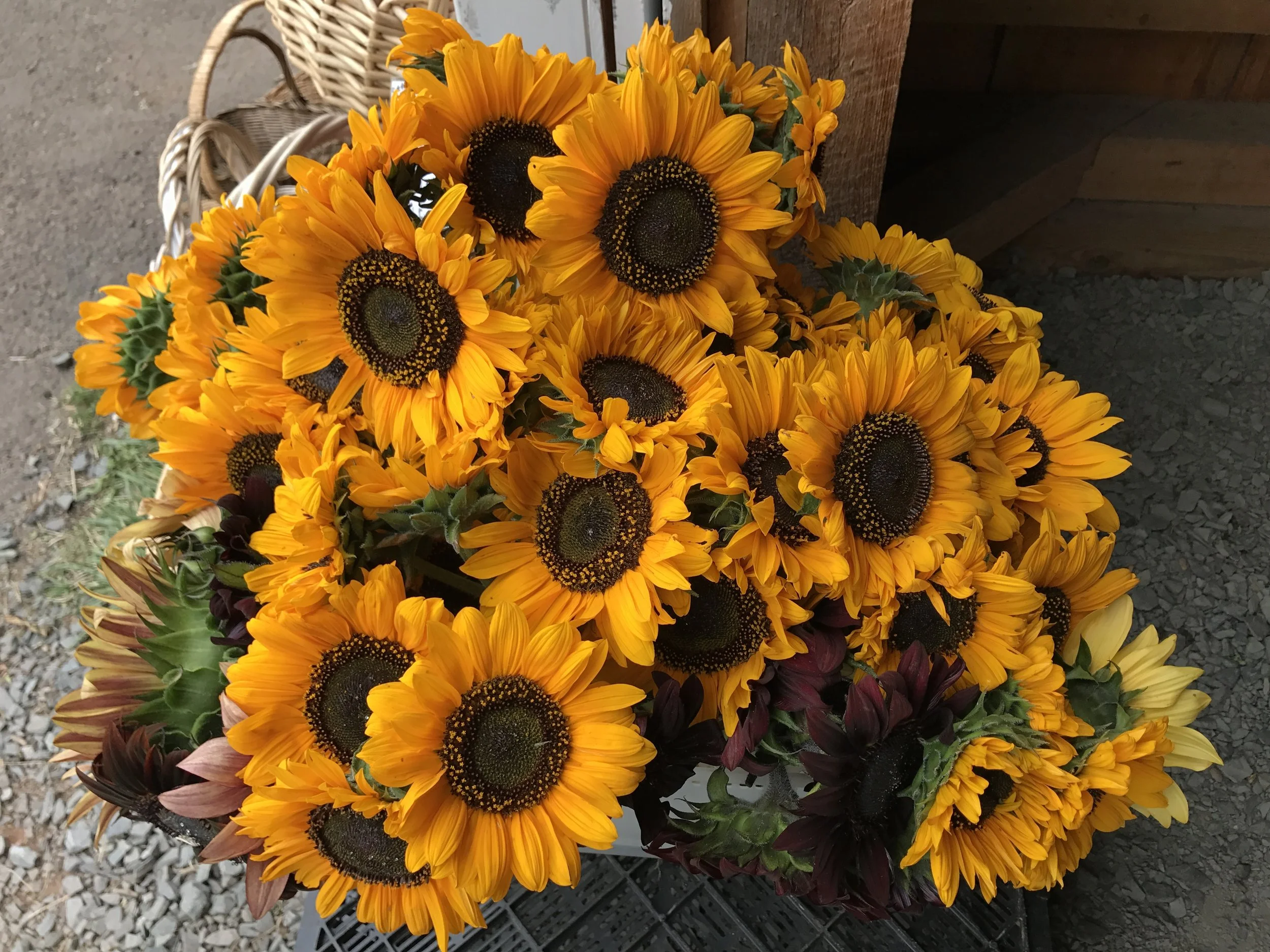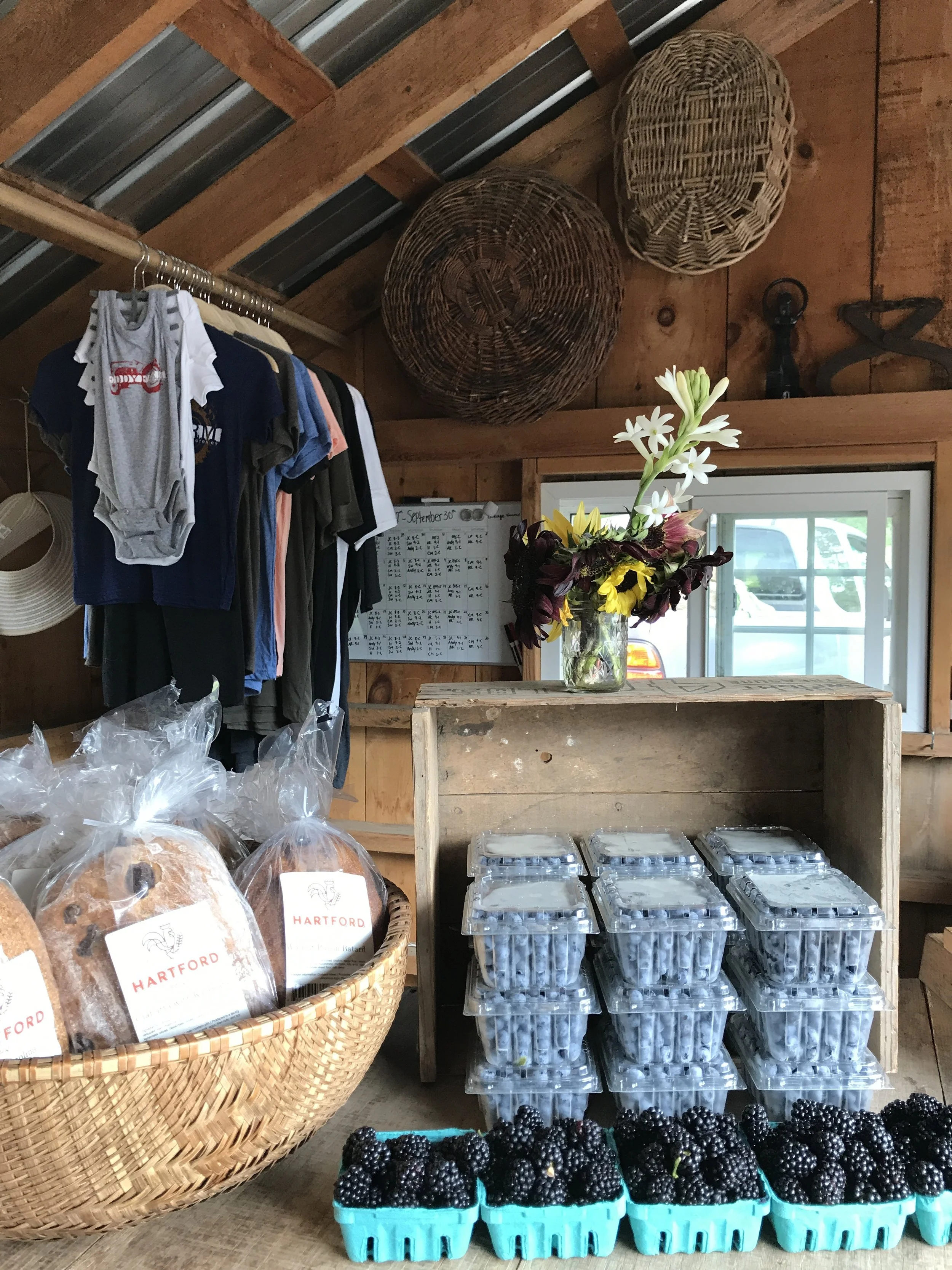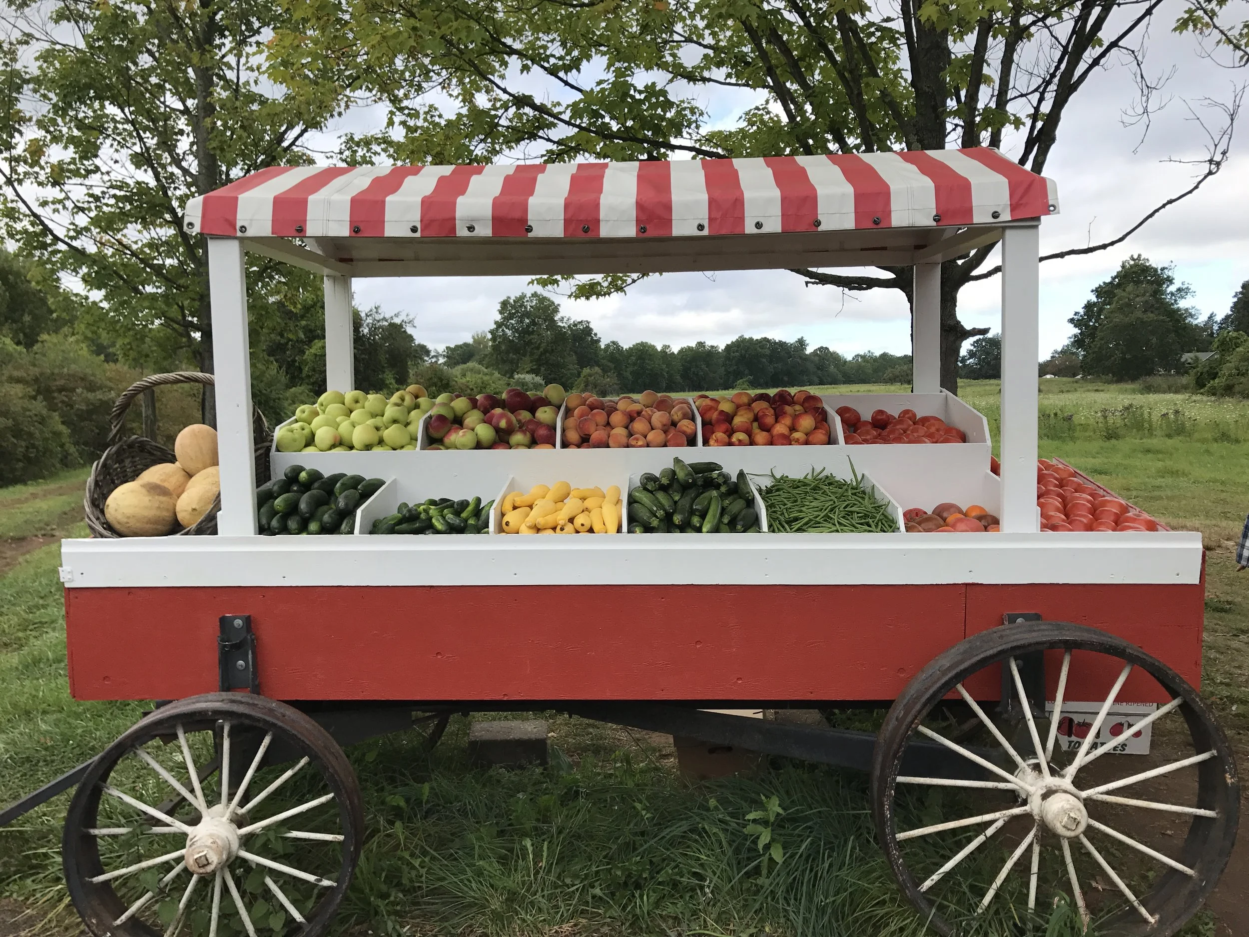 Today's produce menu: silver queen corn, honeybun corn, butter & sugar corn, lettuce, radishes, green beans, native tomatoes, native heirloom tomatoes, sungold tomatoes, sweet peppers, dried red onions, garlic, honey crisp apples, McIntosh apples, peaches, nectarines, raspberries, pickling cucumbers, salad cucumbers, yellow squash, zucchini, beets, rainbow Swiss chard, kale, bread from Hartford Baking Co., zinnia, sunflower, and mixed bouquets from here on the farm.