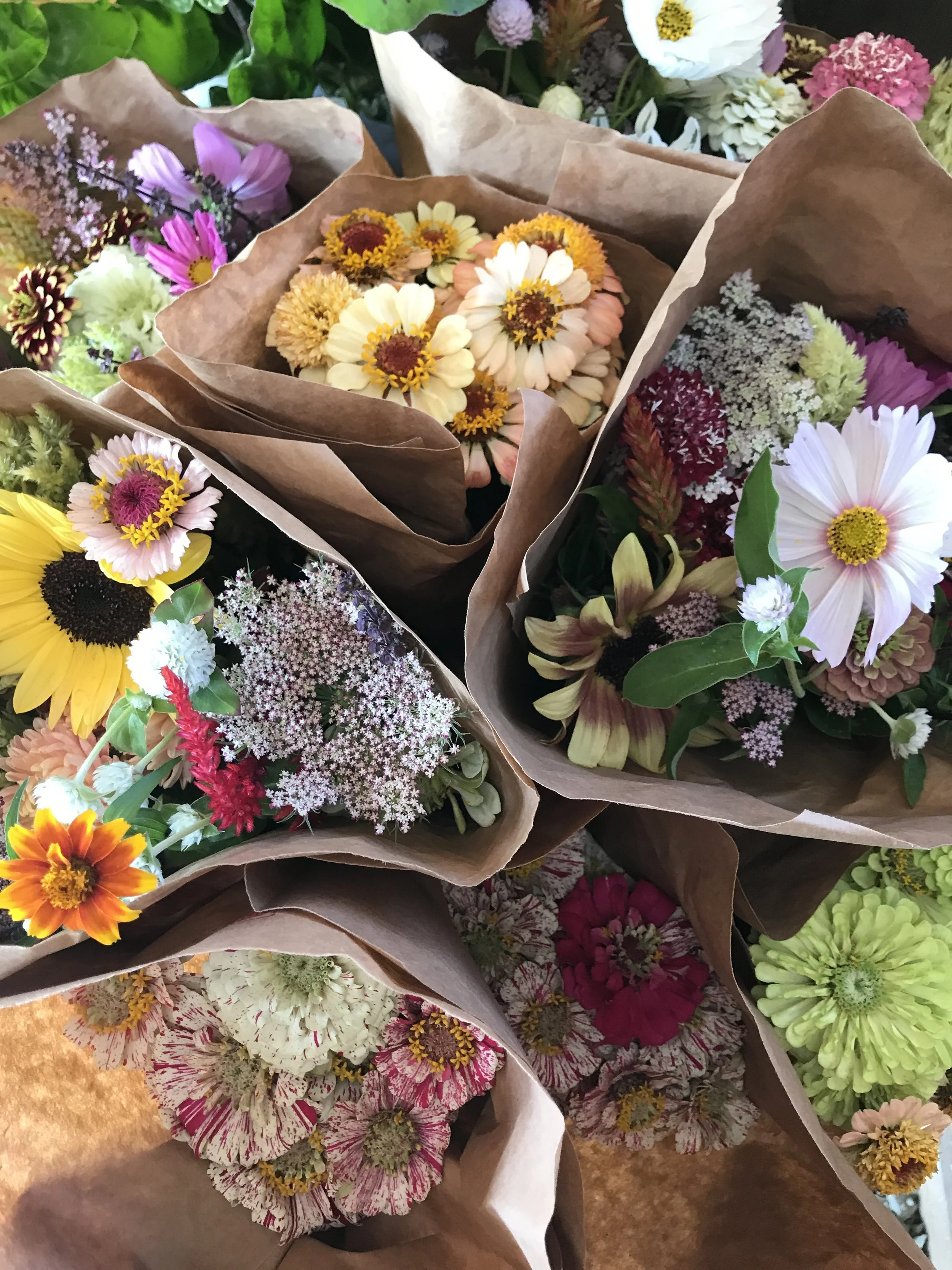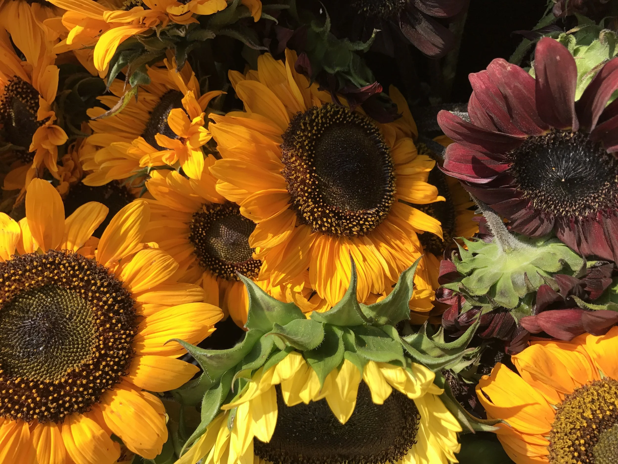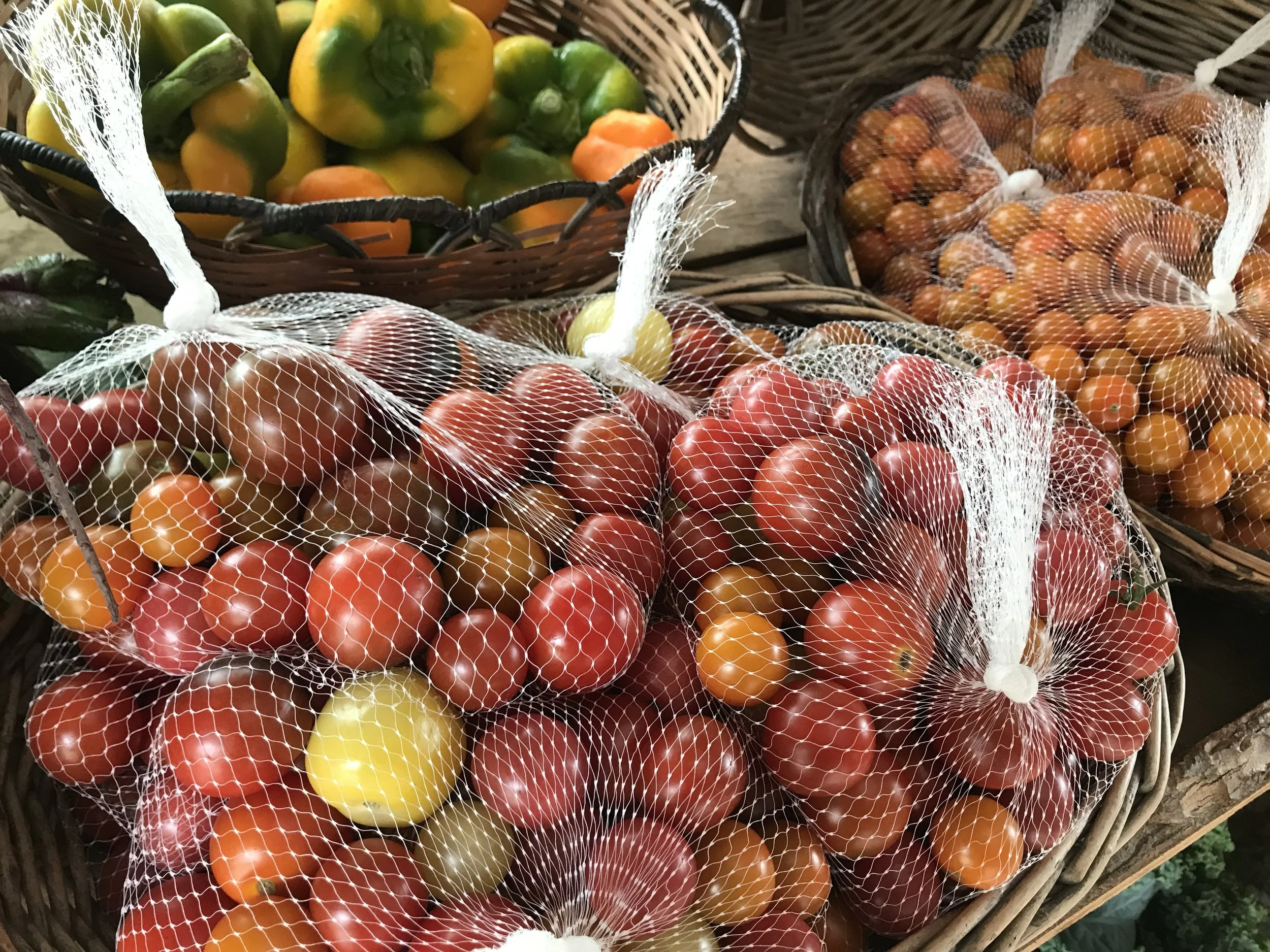 Today's produce menu: silver queen corn, honeybun corn, butter & sugar corn, lettuce, radishes, green beans, native tomatoes, native heirloom tomatoes, sungold tomatoes, sweet peppers, dried red onions, garlic, honey crisp apples, McIntosh apples, peaches, nectarines, raspberries, pickling cucumbers, salad cucumbers, yellow squash, zucchini, beets, rainbow Swiss chard, kale, bread from Hartford Baking Co., zinnia, sunflower, and mixed bouquets from here on the farm.